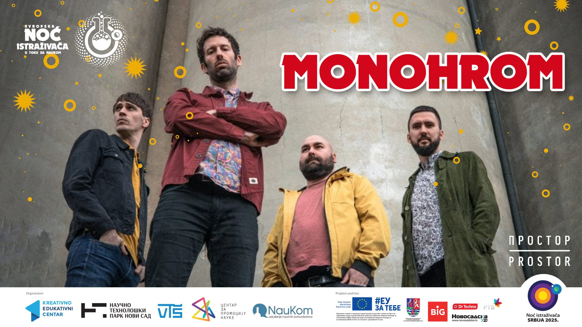 Monohrom je novosadski bend osnovan 2016. godine koji čine koji čine Oskar (gitara, vokal i istraživač sa Insituta Biosens), Nenad (bubanj), Nemanja (bas) i Robert (gitara). Inspirisan britanskom alternativnom scenom ’90-ih, indie rokom 2000-ih i rokenrolom ’60-ih, bend stvara autentičan zvuk koji spaja različite muzičke uticaje.
